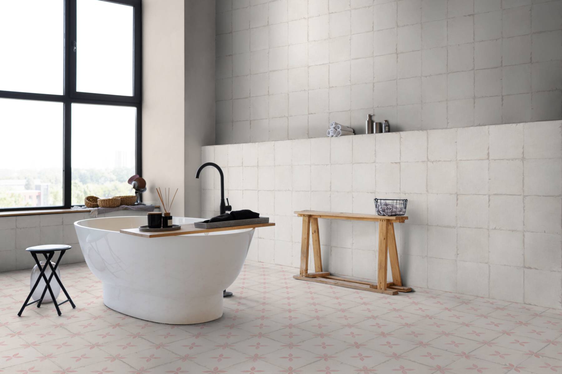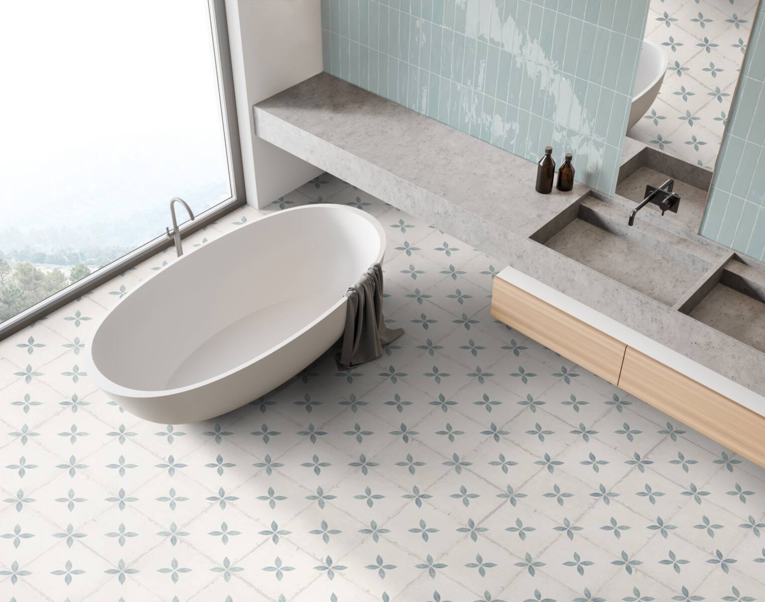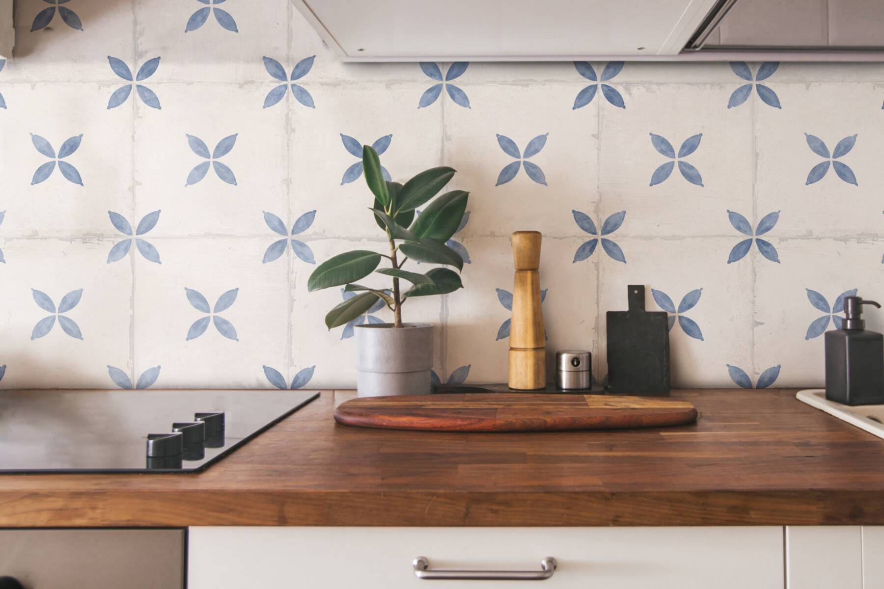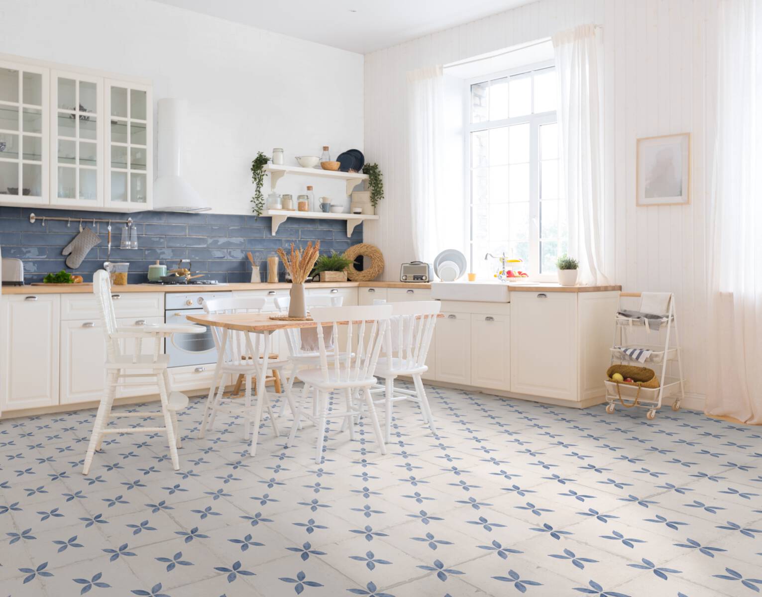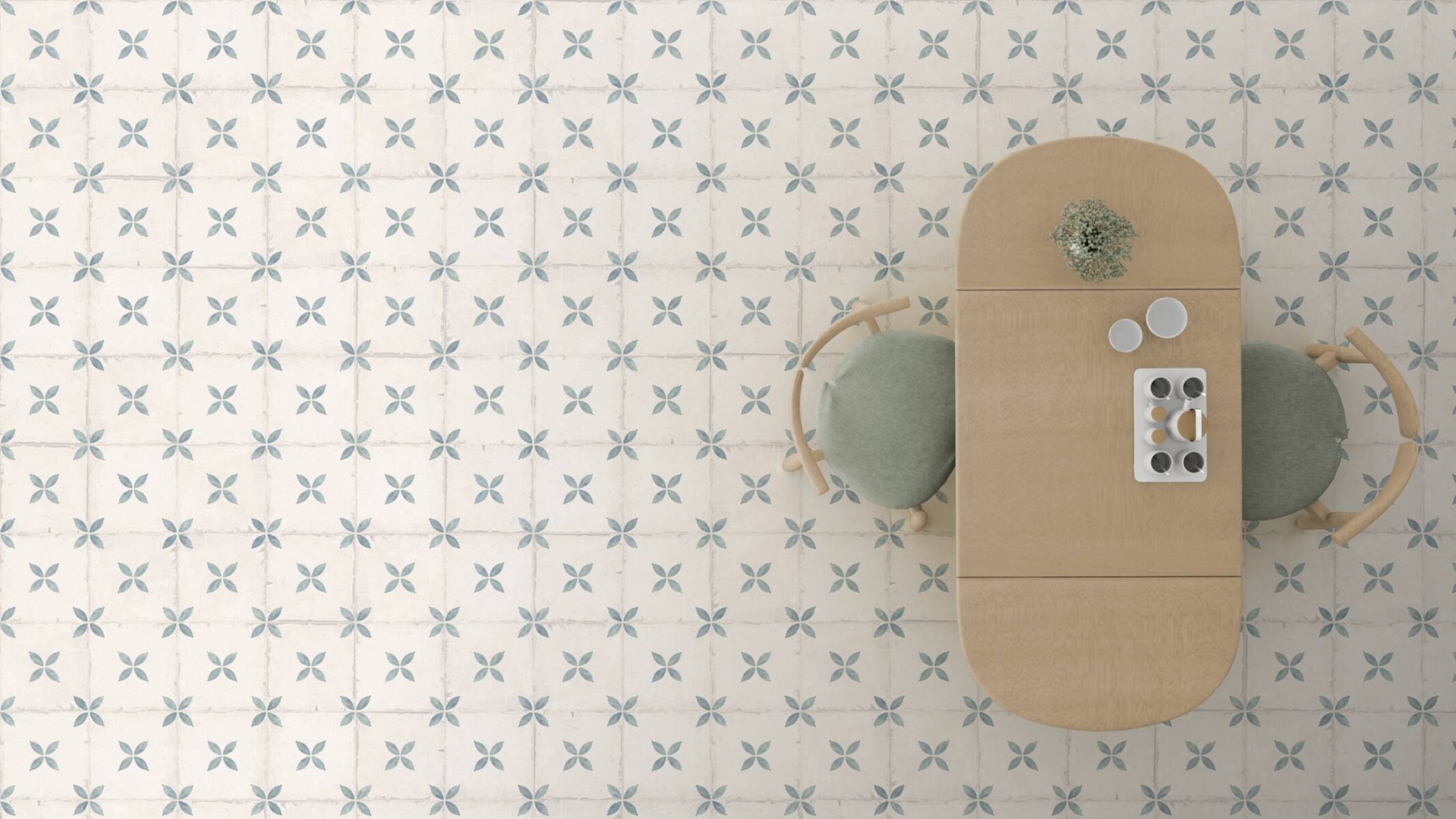 Die Leichtigkeit des Seins gebannt auf eine Fliese. Das stilisierte Blattmotiv in Blau und Türkis auf off-whitem Untergrund ist dekorativ und zugleich nicht einnehmend. Als Blickfang an der Küchenwand oder als vollflächiger Bodenbelag, der Vintagecharme verzaubert.