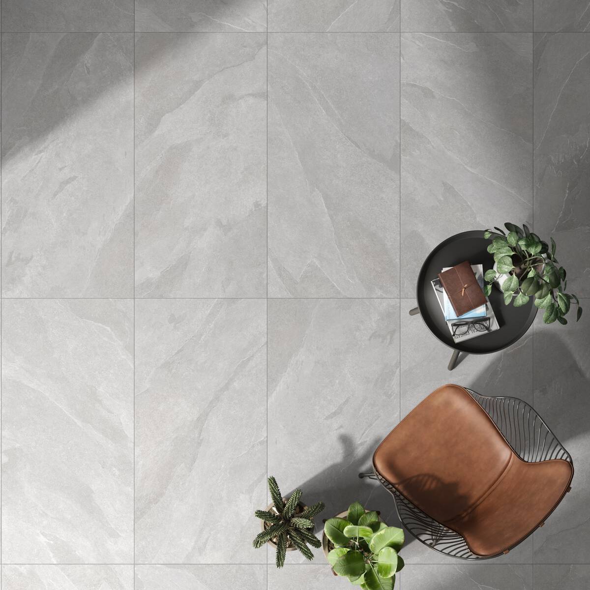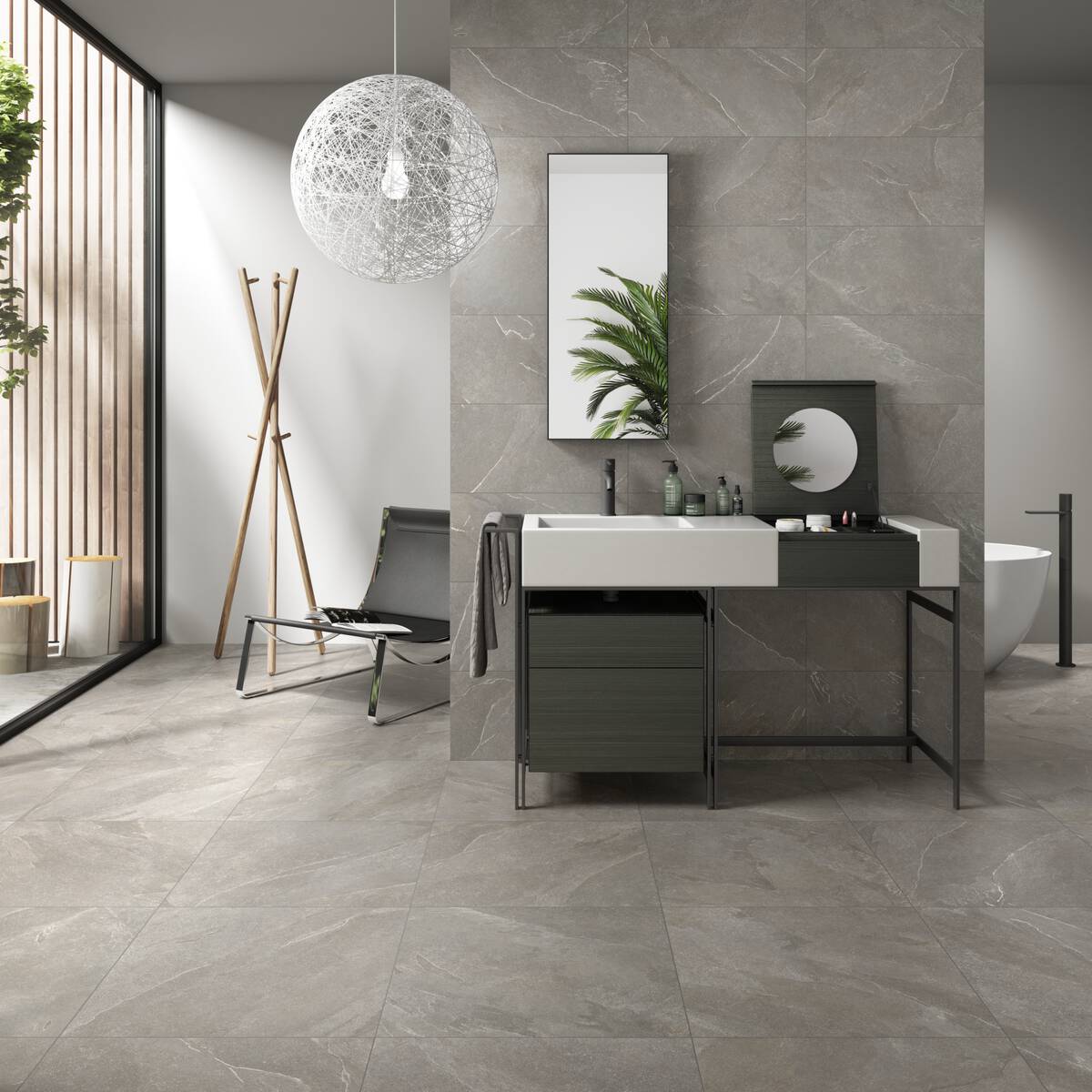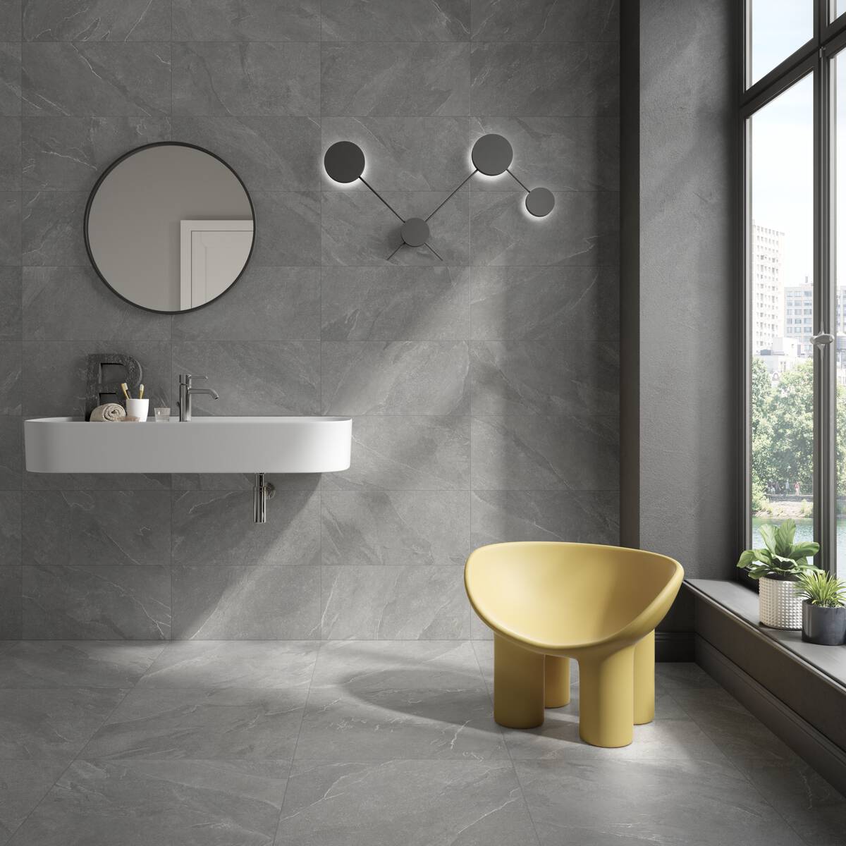 Ein intensives Raumgefühl erzeugt diese moderne Schieferoptik durch die kraftvollen Strukturen der authentischen Oberfläche. Die stilvolle Farbpalette ermöglicht sowohl minimalistisch monochrome oder klassisch kontrastreiche Gestaltungen. Arrangements mit golden oder schwarzen Accessoires runden das Ambiente perfekt ab.