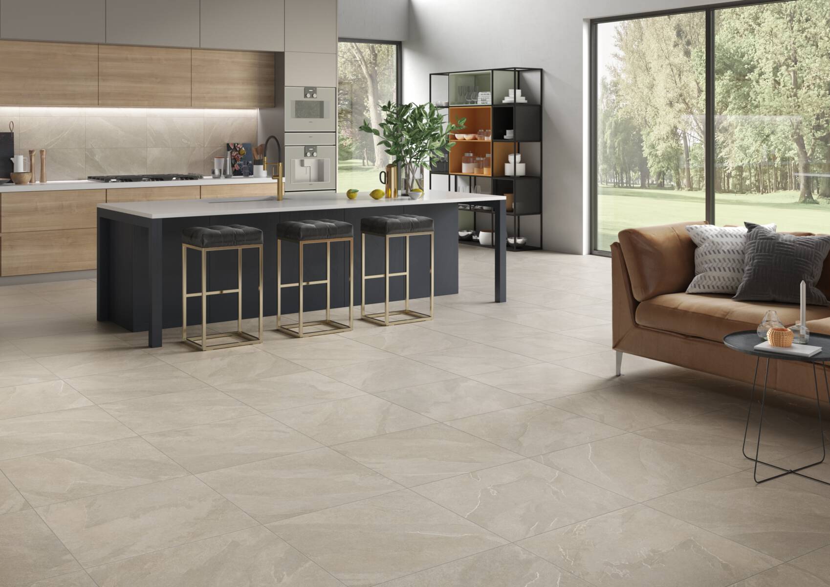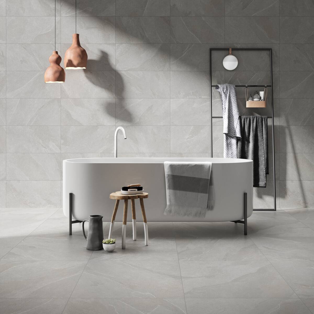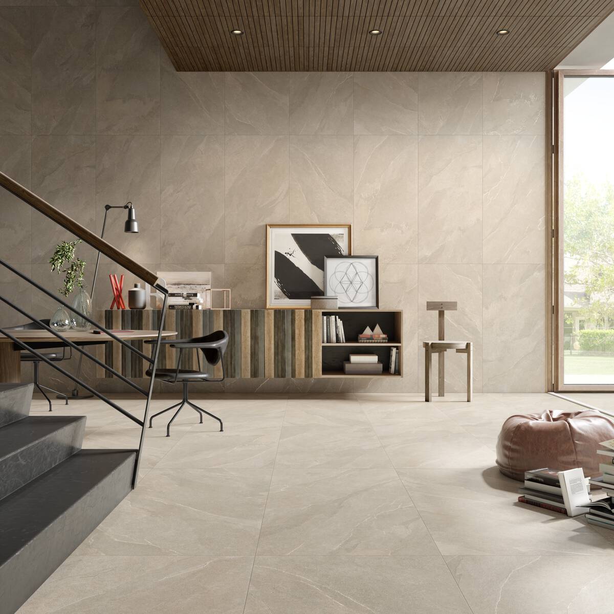 Ein intensives Raumgefühl erzeugt diese moderne Schieferoptik durch die kraftvollen Strukturen der authentischen Oberfläche. Die stilvolle Farbpalette ermöglicht sowohl minimalistisch monochrome oder klassisch kontrastreiche Gestaltungen. Arrangements mit golden oder schwarzen Accessoires runden das Ambiente perfekt ab.