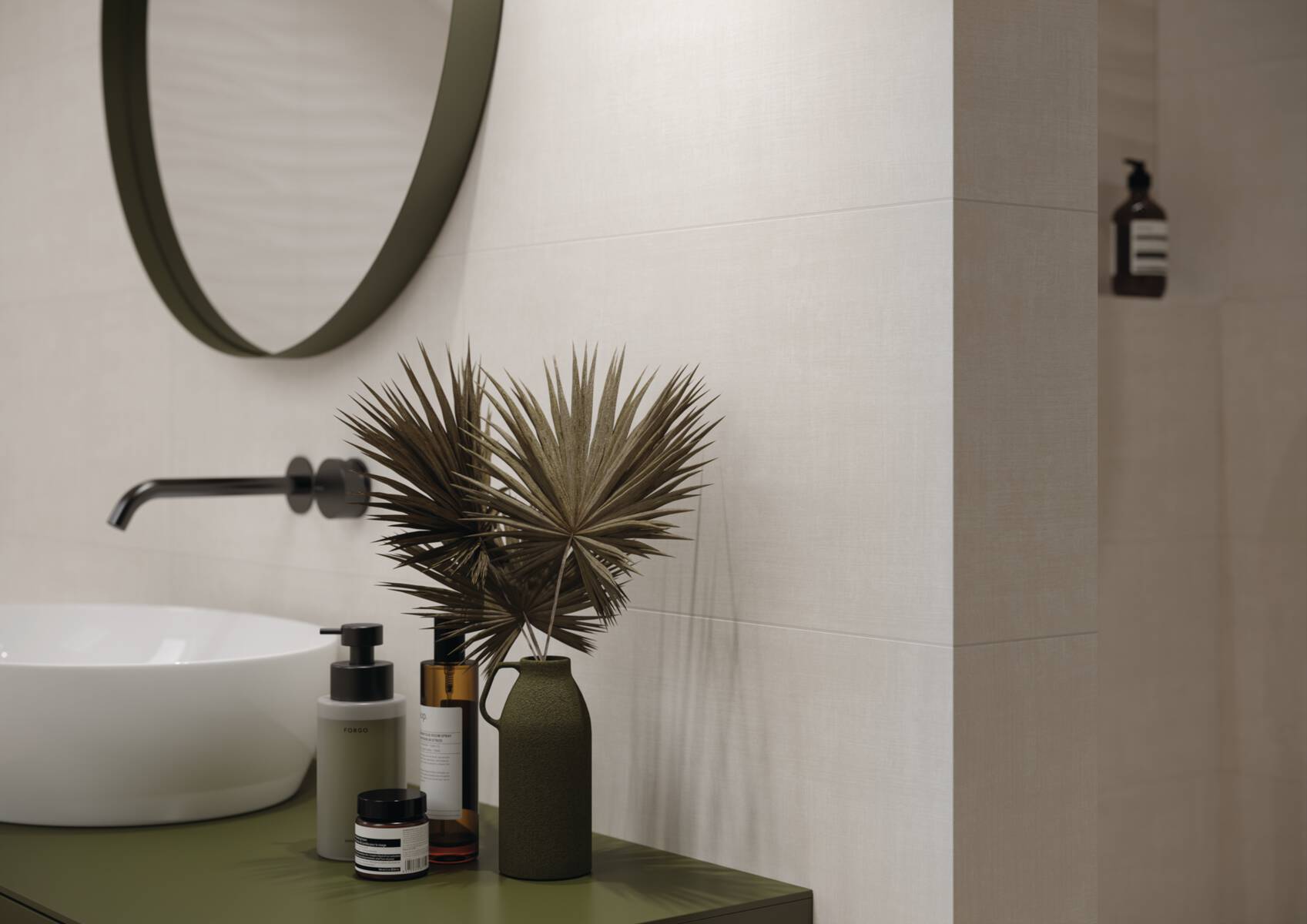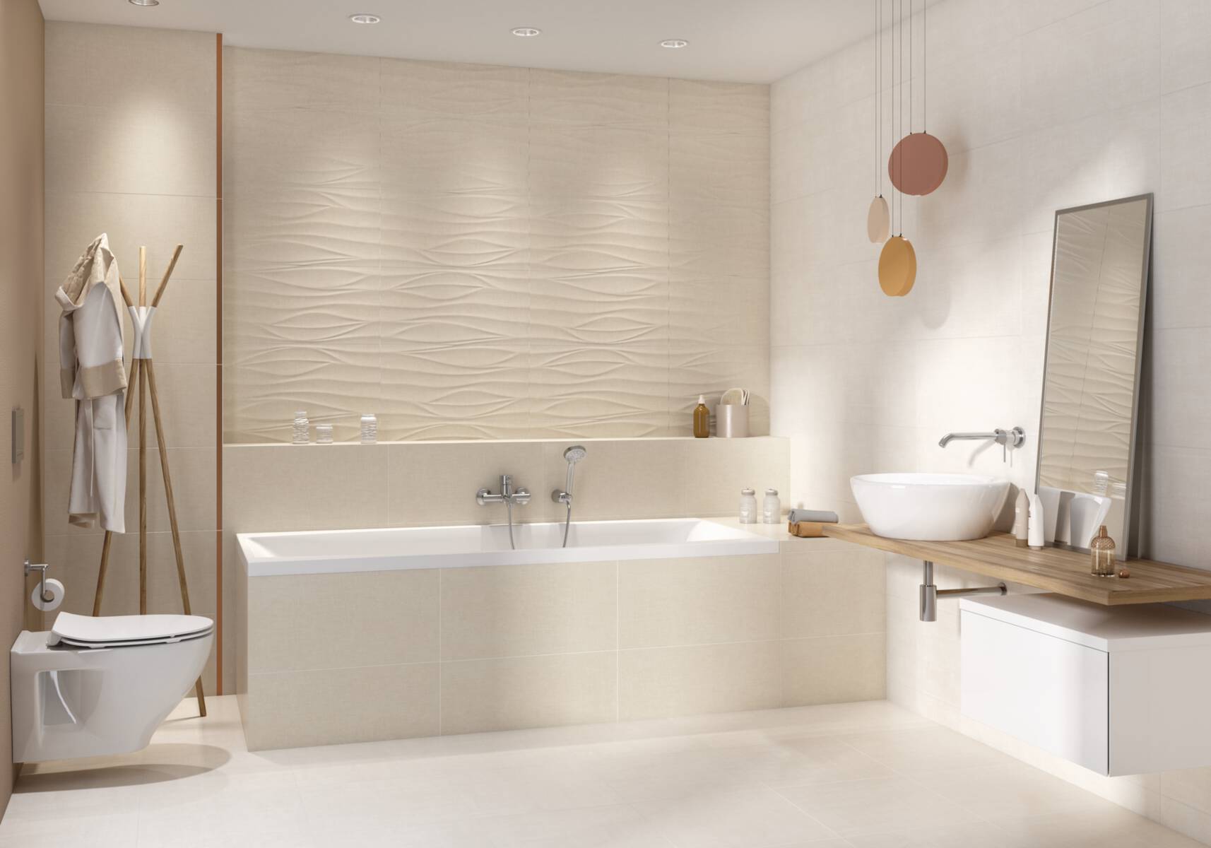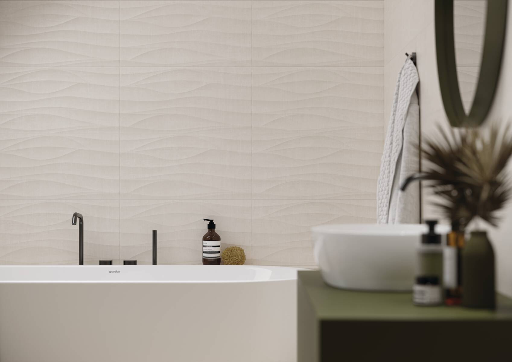 Die sanften Strukturen der gestrichenen wirkenden Oberfläche erfüllen den Raum mit Leichtigkeit und kleiden die Wandflächen dekorativ, aber dezent in den Nuancen white, cream und grey.