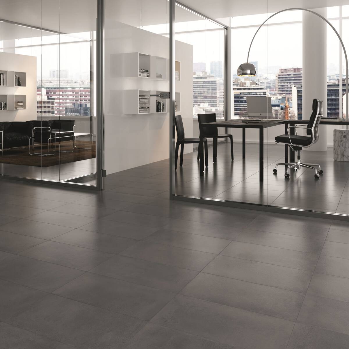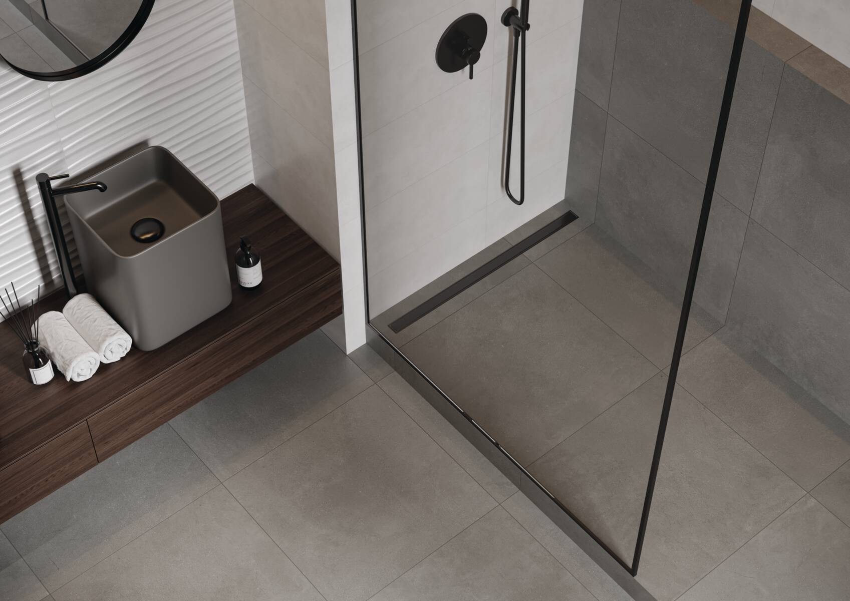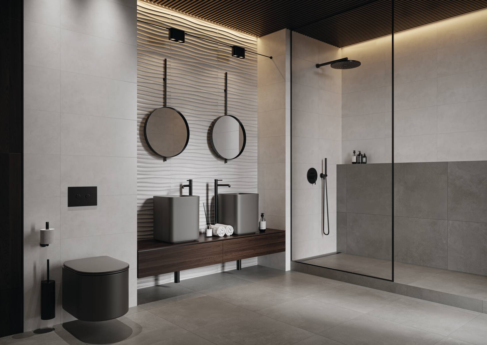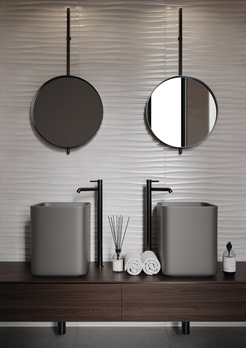 Der Klassiker in vier fein aufeinander abgestimmten innovativen Grau- Beigetönen zeigt sich als vielseitiger moderner Flächenbelag. Mit ihren mäßig starken Materialzeichnungen balanciert die Betonoptik kunstvoll zwischen modernem Minimalismus und urbanem Used-Style. Spannende Kontraste entstehen mit den dezent marmorierten Wandfliesen.